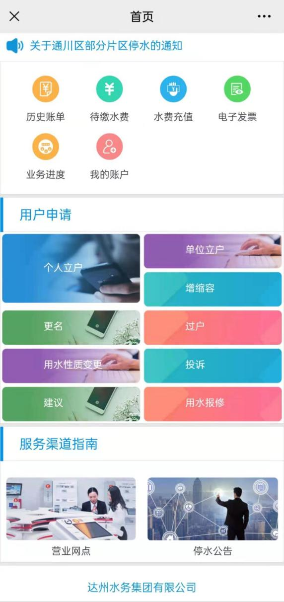 關(guān)注“達(dá)州水務(wù)集團(tuán)有限公司”公眾號,點(diǎn)擊“微營業(yè)廳”中的“營業(yè)大廳”。