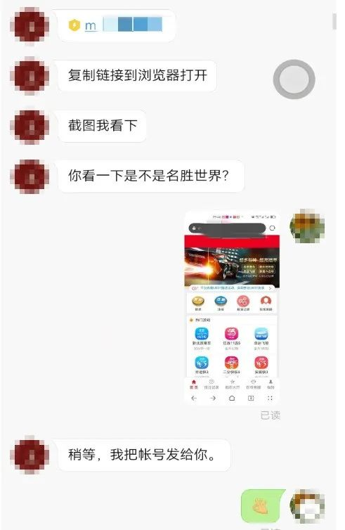 在該小眾聊天軟件中,王恒向張女士發(fā)來一個名為“名勝世界”的網(wǎng)頁鏈接,要求她幫忙登錄其賬號進行測試。