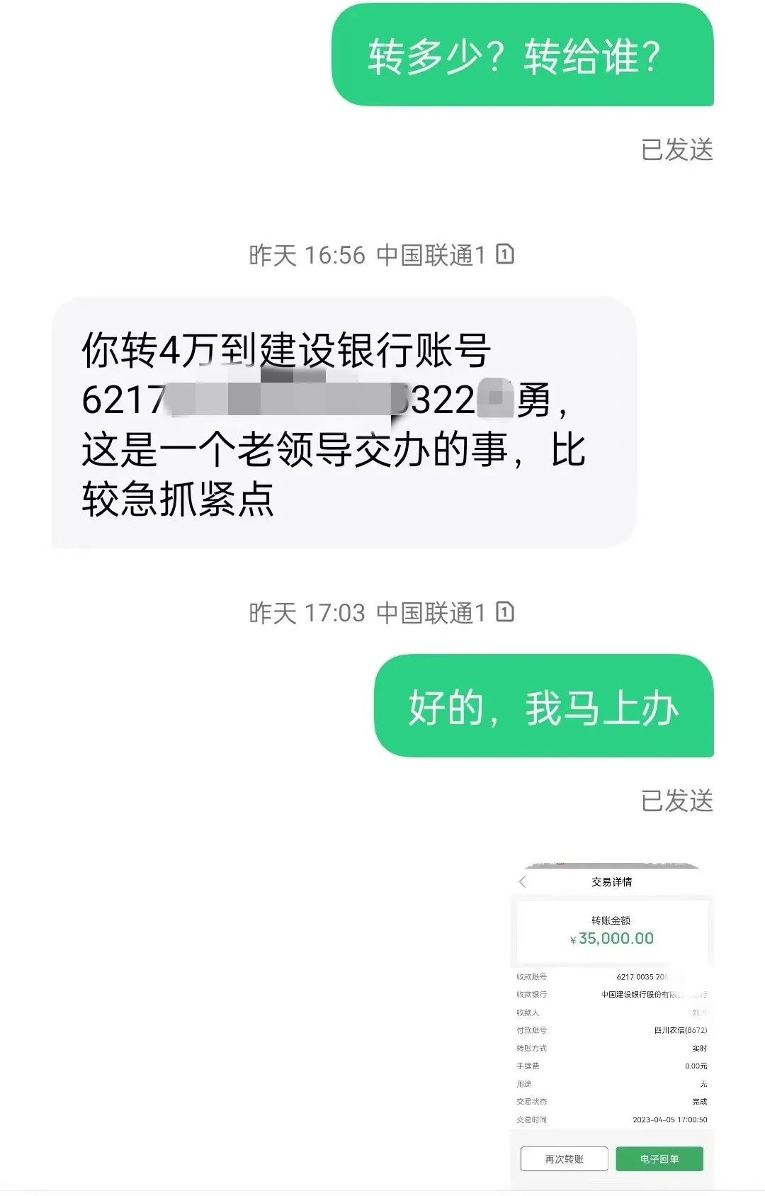 李老板見“局長”讓幫忙,立即將自己卡上的僅有的三萬五千元轉至對方指定賬戶。但轉款后,他發(fā)現(xiàn)“局長”短信不回,電話也無法接通,后通過核實才發(fā)現(xiàn)自己被騙。
