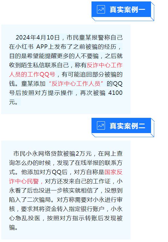 受害人在QQ、網(wǎng)上搜索“反詐中心”“在線報警”,騙子會假模假樣地指導受害人提供證據(jù)材料,再提出讓受害人向指定賬戶轉賬,最后導致受害人二次陷入騙局。